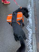 Received with a black leash, it's nice! Quality material, well sewn and used fabrics are correct for use. The pockets are not very large, but so we are sure not to load the dog too much. In size M, each pocket is approximately 1 liter. The harness itself is very comfortable for the dog, and once well adjusted, it does not slip. I am very satisfied with the material and the store.